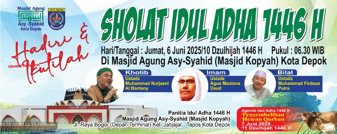 SINAR MERDEKA ,Kota Depok – Masjid Jami’ Asy-Syahid atau yang akrab dikenal sebagai Masjid Kopyah akan menggelar Sholat Idul Adha 1446 Hijriah pada Jumat, 6 Juni 2025 bertepatan dengan 10 Dzulhijah 1446 H. Pelaksanaan sholat akan dimulai tepat pukul 06.30 WIB di halaman masjid yang terletak di Jl. Raya Bogor, depan Terminal Jatijajar, Kecamatan Tapos, Kota Depok.