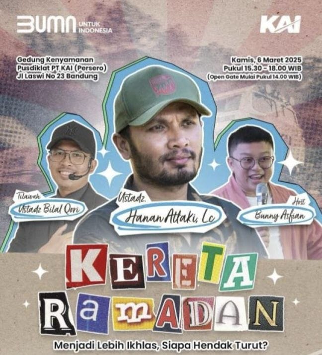 Kereta Ramadan akan berlangsung dari pukul 15.30 hingga 18.00 WIB dengan open gate mulai pukul 14.00 WIB. Acara ini menghadirkan berbagai sesi inspiratif, termasuk tilawah oleh Ustadz Bilal Qori serta tausiyah dari Ustadz Hanan Attaki, Lc., yang akan menyampaikan pesan-pesan kebaikan untuk menyambut Ramadan dengan hati yang lebih ikhlas. Acara ini juga akan dipandu oleh Bunny Asfian sebagai host.