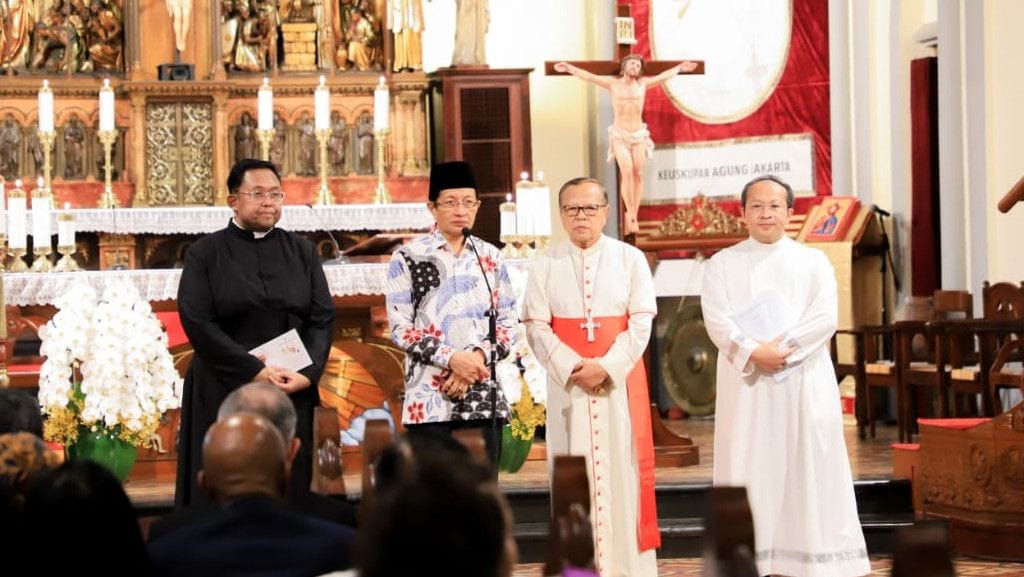 SINAR MERDEKA , Jakarta – Menteri Agama Nasaruddin Umar menyampaikan sambutan sebelum pelaksanaan Misa Requiem bagi Paus Fransiskus di Gereja Katedral Jakarta. Turut hadir, Uskup Agung Jakarta, Ignatius Kardinal Suharyo.