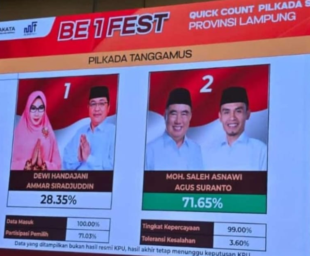 Hasil sementara hitung cepat (quick count) Rakata untuk Pilkada Tanggamus 2024 menempatkan pasangan calon (Paslon) Bupati dan Wakil Bupati Tanggamus Nomor 2 H.Moh.Saleh Asnawi-Agus Suranto unggul dengan raihan suara 71,65 persen.
