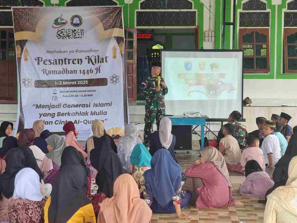 SINAR MERDEKA ,Kapuas Hulu – Dalam rangka menyambut bulan suci Ramadan, Satgas Pamtas RI-Malaysia Yonzipur 5/ABW bersama dengan para Guru turut andil dalam kegiatan Pesantren Kilat untuk jenjang SD, SMP, dan SMA resmi dibuka dari tanggal 1 sampai 3 Maret 2025 di Masjid Besar “Nurul Hudud” di Desa Badau , Kecamatan Badau, Kabupaten Kapuas hulu, Minggu (2/3/2025).