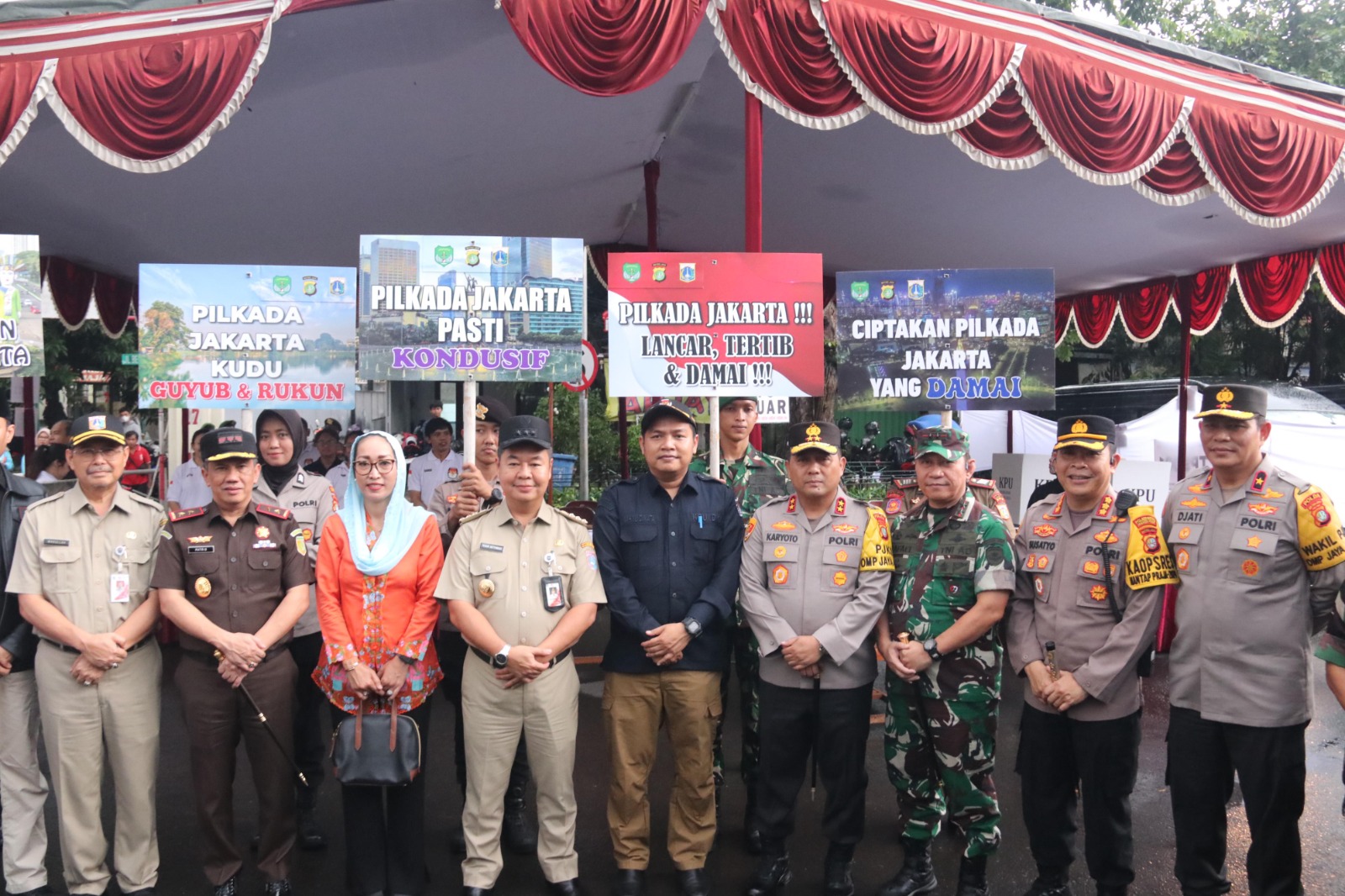 Rombongan memulai peninjauan di TPS 23 depan Asrama Brimob KS Tubun, Jakarta Barat. Pj Gubernur, Kapolda, dan Pangdam didampingi Ketua KPU DKI Wahyu Dinata, Ketua Bawaslu DKI Munandar Nugraha, dan Sekda DKI Marulli Matali.