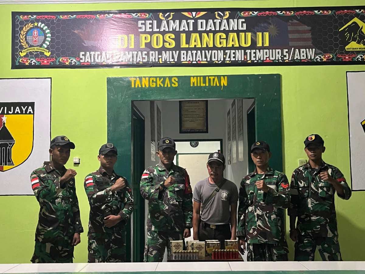 Kapuas Hulu – Tingkatkan stabilitas keamanan wilayah perbatasan, Satgas Pamtas RI-Malaysia Yonzipur 5/ABW telah berhasil melakukan penangkapan terhadap satu orang warga yang membawa munisi Tabur Kaliber 12,70 mm merk Alphamax + Magnum sebanyak 3 dus dan Megastar sebanyak 3 dus dengan jumlah munisi sebanyak 150 butir, di Sungai Antu, Kecamatan Puring Kencana, Kabupaten Kapuas hulu, Sabtu (28/12/2024).
